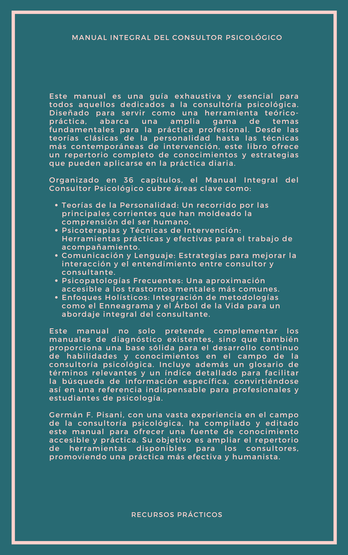 El Manual Integral del Consultor Psicológico sobresale por su combinación única de amplitud y profundidad de contenido, accesibilidad y utilidad práctica. A pesar de sus más de 2000 páginas, su formato está diseñado para facilitar la navegación mediante un sistema de hipervínculos cuidadosamente estructurado, lo que garantiza una experiencia dinámica y fluida para el lector. Este manual ofrece una amplia gama de información detallada y exhaustiva sobre diversos temas relacionados con la consultoría psicológica y temas afines. Adquirirlo significa contar con una herramienta indispensable para mejorar tu práctica profesional y expandir tus conocimientos en el campo de la psicología y el acompañamiento psicológico, sin preocuparte por la extensión del texto, ya que su navegación es ágil y eficiente.